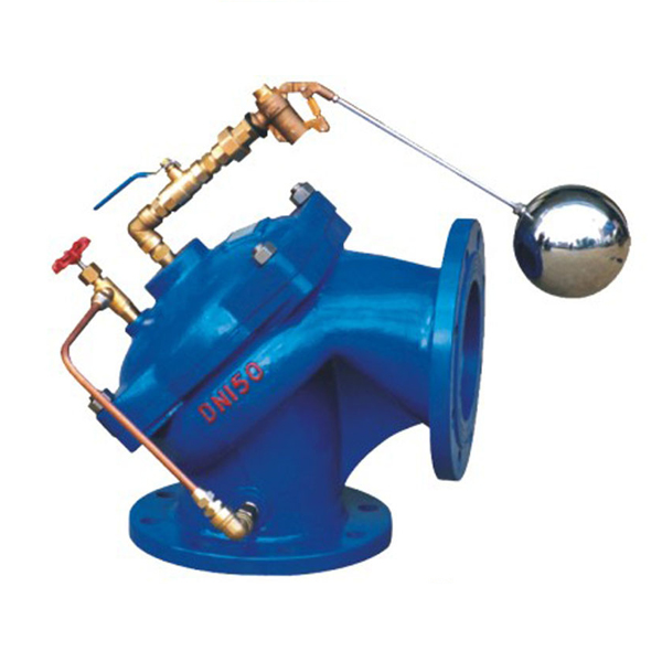 角型定水位閥主要由一角型隔膜式主閥,內部含一片特殊強化尼龍膜片及一只彈簧,并經(jīng)由主閥外部一組控制浮球閥啟閉主閥。當水池水位達到滿水位時,控制浮球閥會先行關閉后再傳訊關閉主閥。當水池水位下降約10公分后控制浮球閥再行開啟,并使主閥重新開啟大量補充進水。