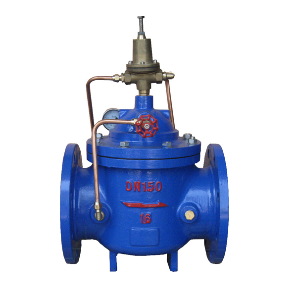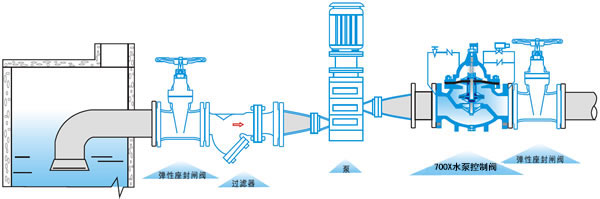 700X多功能水泵控制閥由主閥、電磁導閥、針閥、球閥、單向閥、行程開關、微形過濾器和壓力表組成水力控制接管系統。水泵需停止工作時,先由進口壓使主閥關閉90%后,水泵停止運轉。剩余10%由回水關閉。可防止水錘現象發生。